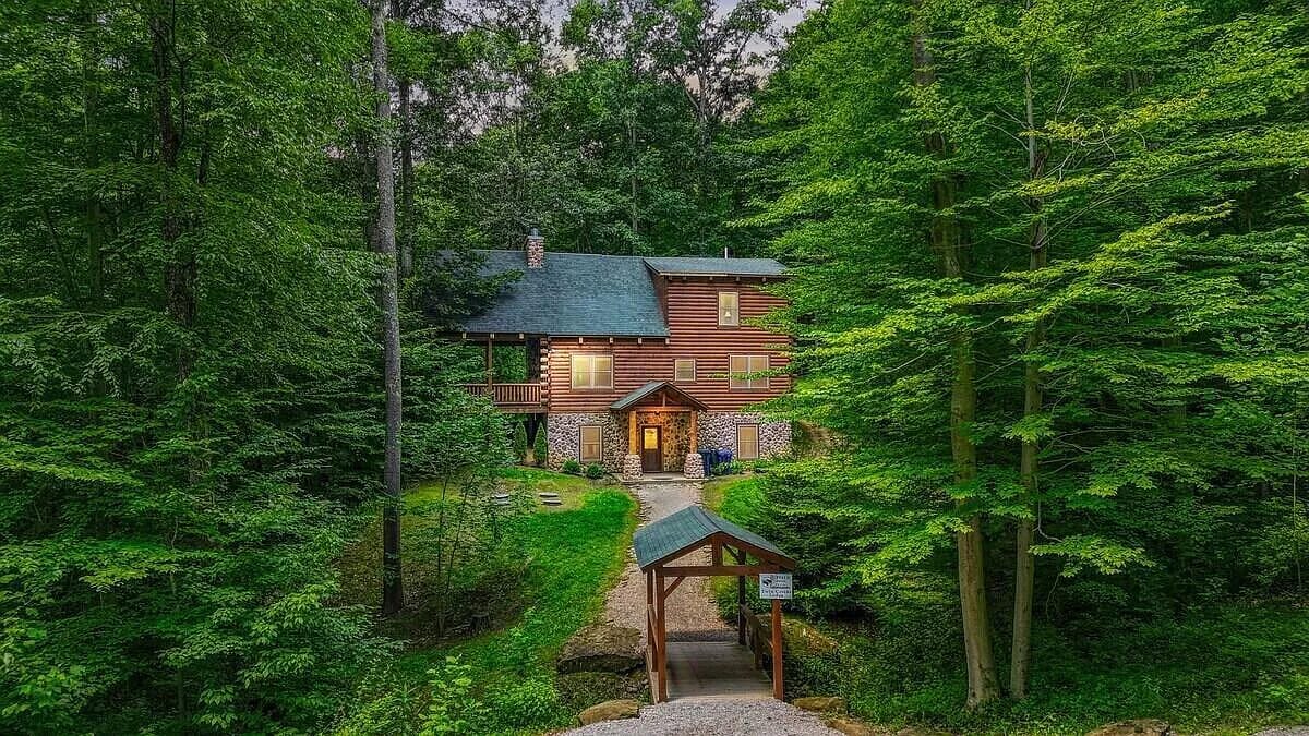 Welcome to Twin Creeks, a fully furnished five bedroom cabin set on eight private wooded acres with a scenic creekside setting and a charming covered bridge entry. This turnkey property offers three levels of finished living space, multiple king suites, an open main living area with a stone fireplace, and a lower level recreation room ideal for group stays. The home comfortably sleeps up to sixteen guests and provides a well planned layout for gatherings, retreats, or multi family use.